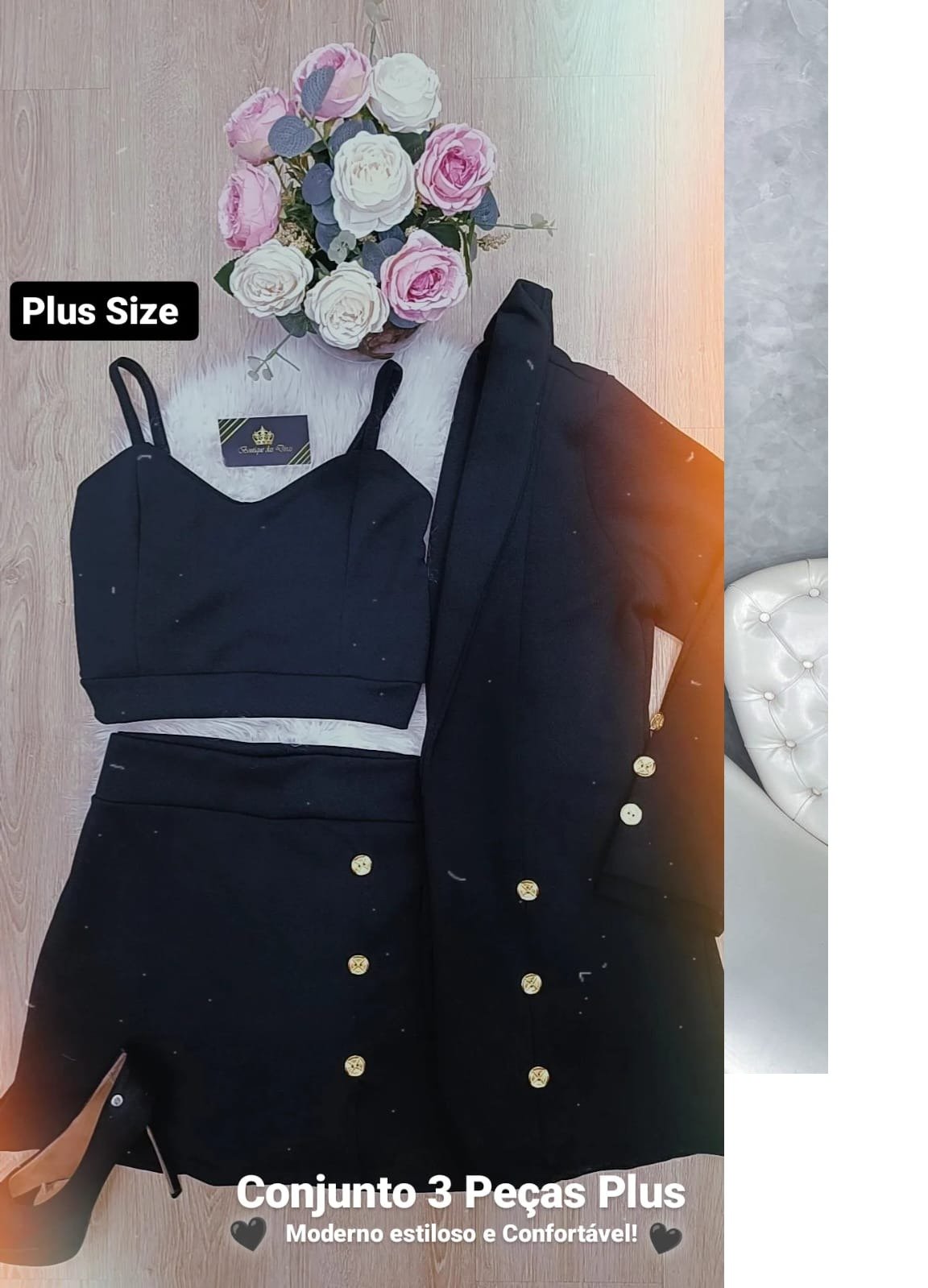 Blazer Alongado acinturadinho com detalhes dourados + Short Saia + Crooped